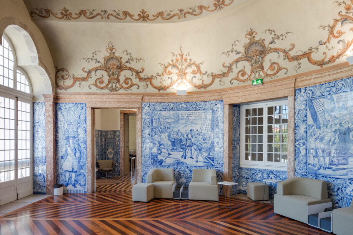 A atmosfera é única: estantes altas ladeiam paredes revestidas a azulejos, os tetos ostentam abóbadas e a escadaria central, em dois lanços curvos, convida à contemplação. No topo, o brasão da família Melo e Castro relembra a linhagem nobre que um dia aqui viveu. O salão nobre, em forma de meia-lua, é uma verdadeira peça de arte, com chão em parquet e detalhes art déco dos anos 1930. A envolvência do espaço transmite uma energia especial – simultaneamente solene e acolhedora.